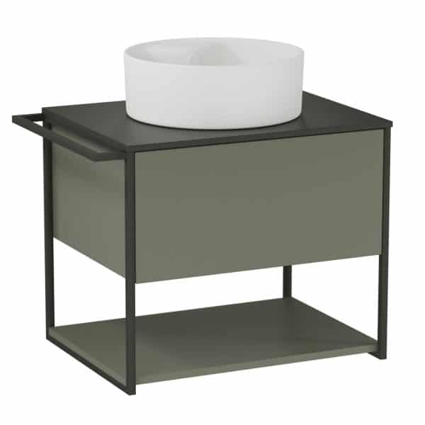 Das BADEDU DUNA Waschbecken mit Unterschrank überzeugt durch sein modernes und stilvolles Design in Kombination mit hoher Funktionalität. Mit einer Breite von 60 cm bietet es ausreichend Platz, ohne im Bad zu viel Raum einzunehmen. Der Unterschrank in einem ansprechenden Grün setzt einen farblichen Akzent und sorgt gleichzeitig für praktischen Stauraum. Das weiße Aufsatzwaschbecken aus hochwertiger Keramik besticht durch seine glatte, pflegeleichte Oberfläche. Die anthrazitfarbene Waschtischplatte rundet das elegante Gesamtbild harmonisch ab und verleiht dem Möbelstück eine zeitlose Moderne.