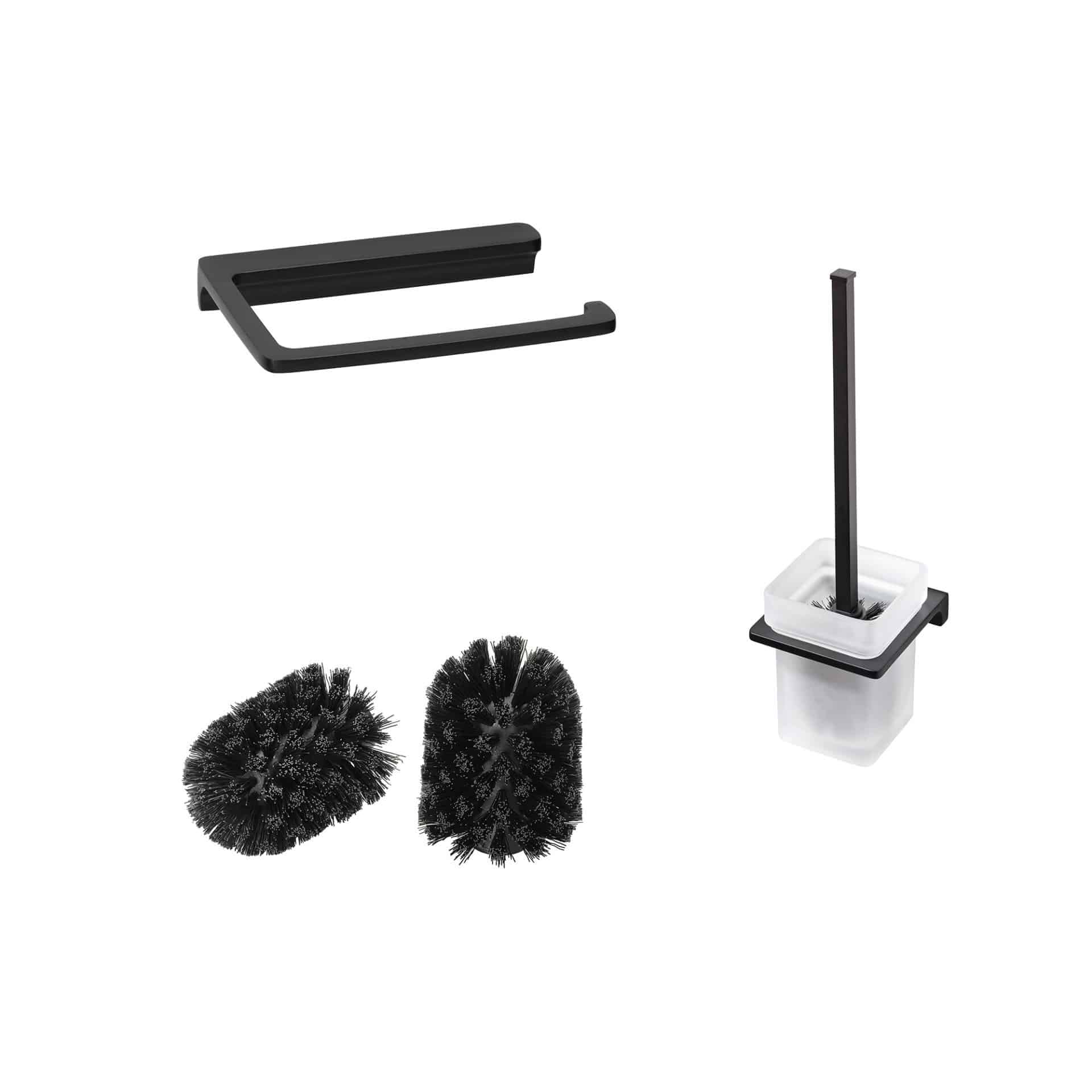 BADEDU SIRIUS Accessoire Set 3-teilig, Schwarz matt, Toilettenpapierhalter, Toilettenbürste mit Halter, 2x Ersatzbürstenköpfe