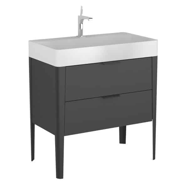 BADEDU SORA Waschbecken mit Unterschrank 80 cm breit, Schwarz matt, Waschbecken Quarzkomposit Weiß, aus Aluminium, mit Füßen