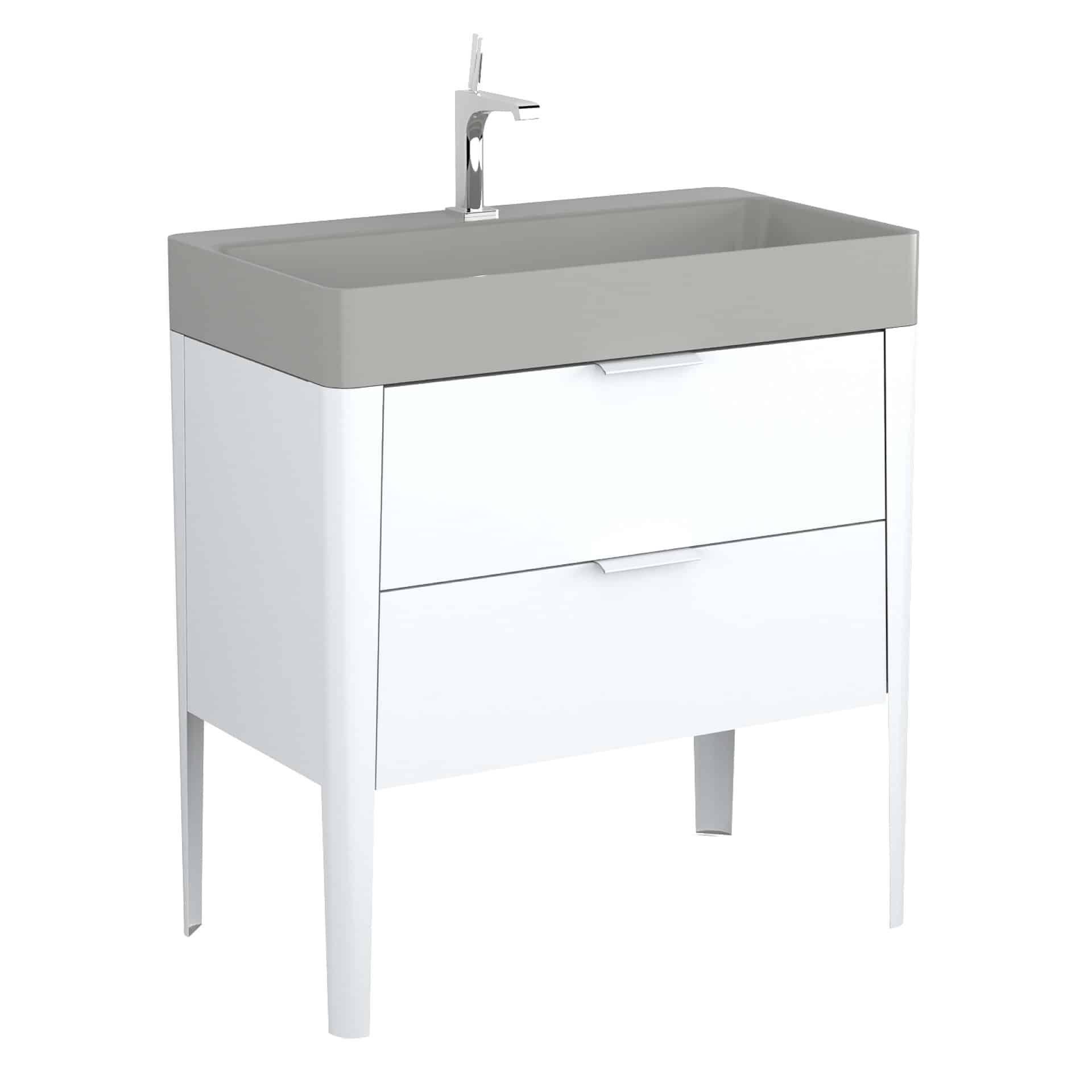 Ja, das schlanke Design und die kompakte Breite von 80 cm eignen sich hervorragend für kleinere Bäder oder Gäste-WCs. Die neutrale Farbgebung (weiß matt & grau) sorgt dabei für eine optische Vergrößerung des Raumes. Zudem können die Füße die Bodenreinigung erleichtern und verhindern Staunässe unter dem Möbel.