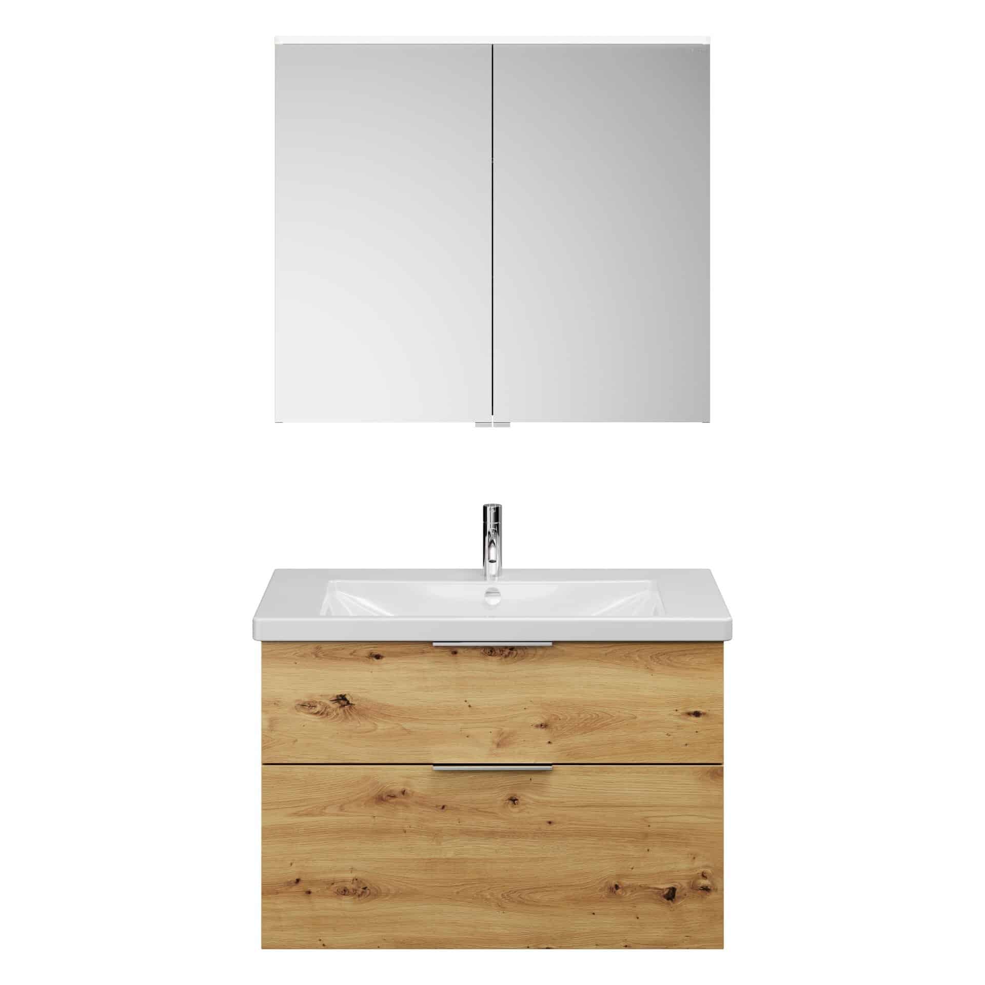 – **Set-Inhalt:** Waschtisch mit großflächigem Stauraum + Spiegelschrank mit verstellbaren Einlegeböden