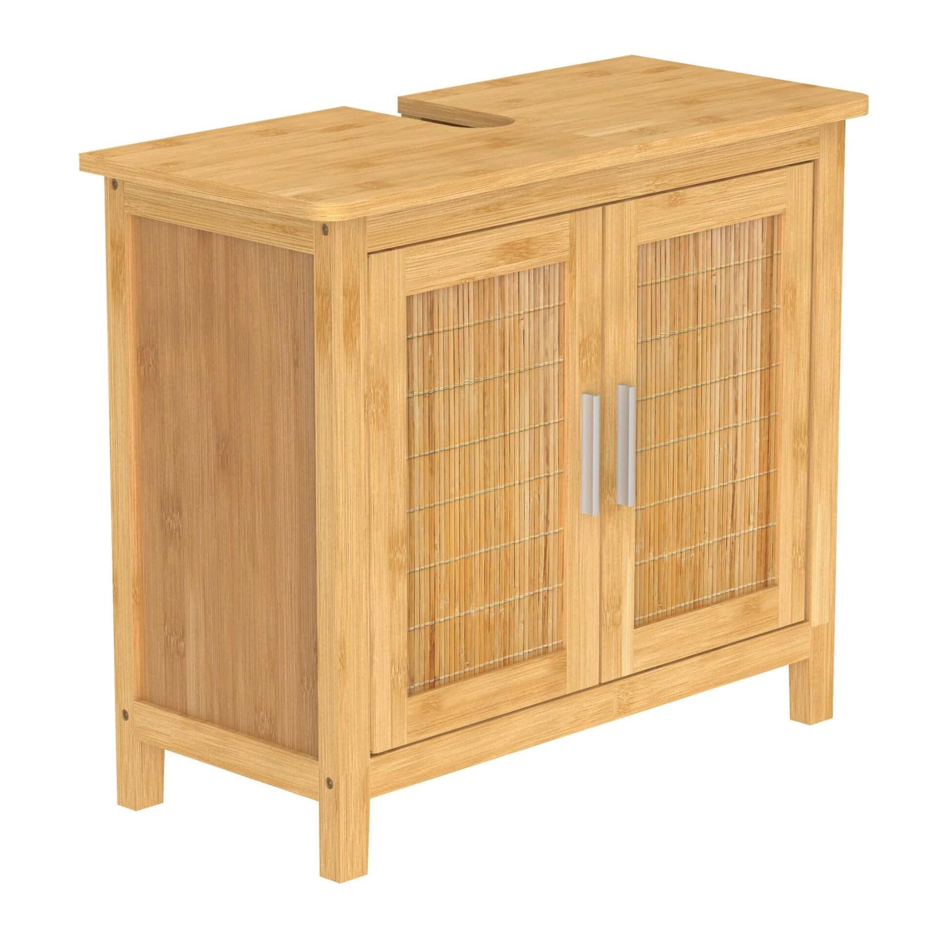 Der Schrank besteht aus hochwertigem Bambusholz, das besonders nachhaltig und umweltfreundlich ist. Bambus wächst schnell nach, ist widerstandsfähig gegen Feuchtigkeit und besitzt von Natur aus antibakterielle Eigenschaften. Dies macht den Unterschrank ideal für den Einsatz in feuchten Badezimmerumgebungen, da er weniger anfällig für Schimmel und Verformungen ist im Vergleich zu herkömmlichen Holzarten.