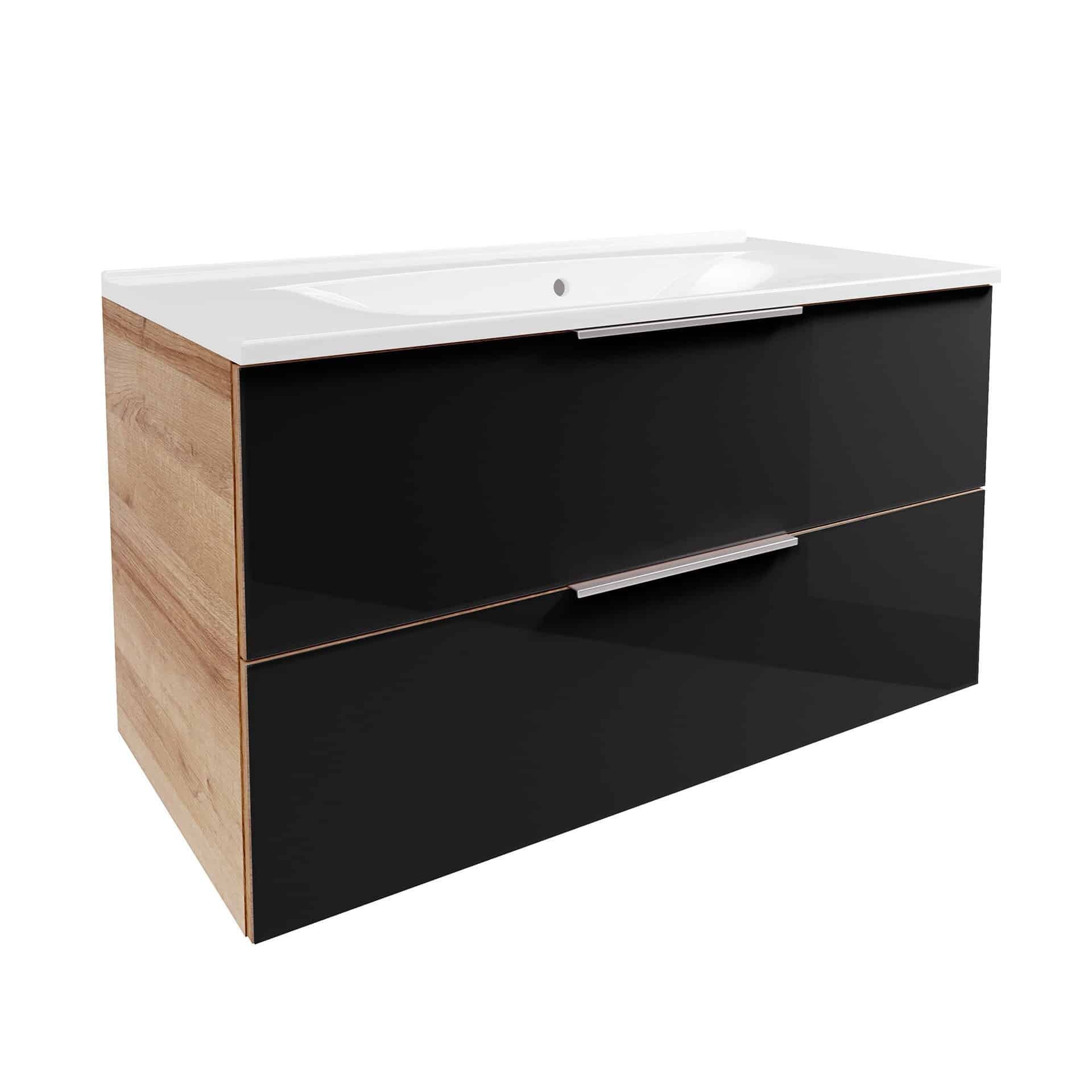 Das Set hat eine Breite von 100 cm, wodurch es eine kompakte und sehr praktische Größe für Standardbadezimmer bietet. Dank der schlanken Form kann es auch in Gäste-WCs oder kleinen Badezimmern eingesetzt werden, ohne den Raum zu erdrücken. Die tiefen Waschtische schaffen dennoch ausreichend Fläche zum Waschen und Abstellen.