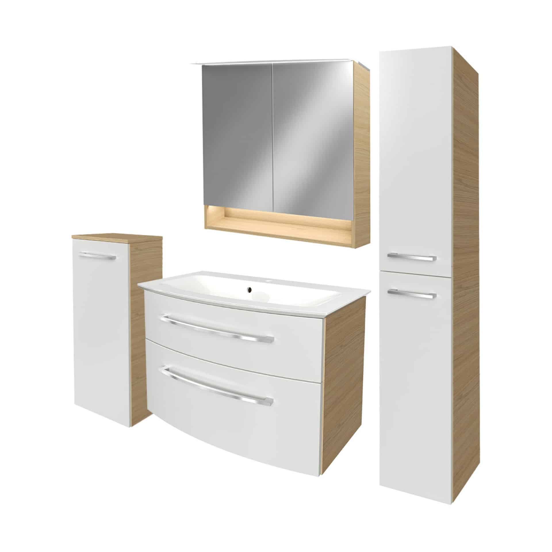 Fackelmann B.STYLE Badmöbel Set 5-teilig, 83 cm, Weiß/Braun + LED-Spiegelschrank + 2 Badschränke