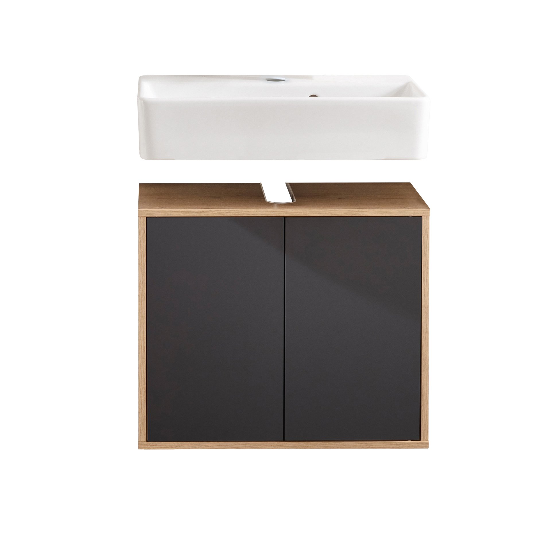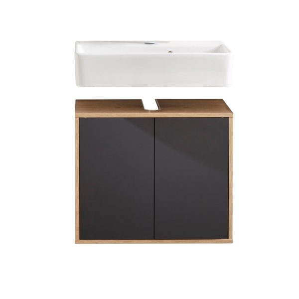 FACKELMANN FINN Waschbecken mit Unterschrank 60 cm breit, Anthrazit/Braun hell, Waschbecken Keramik Weiß