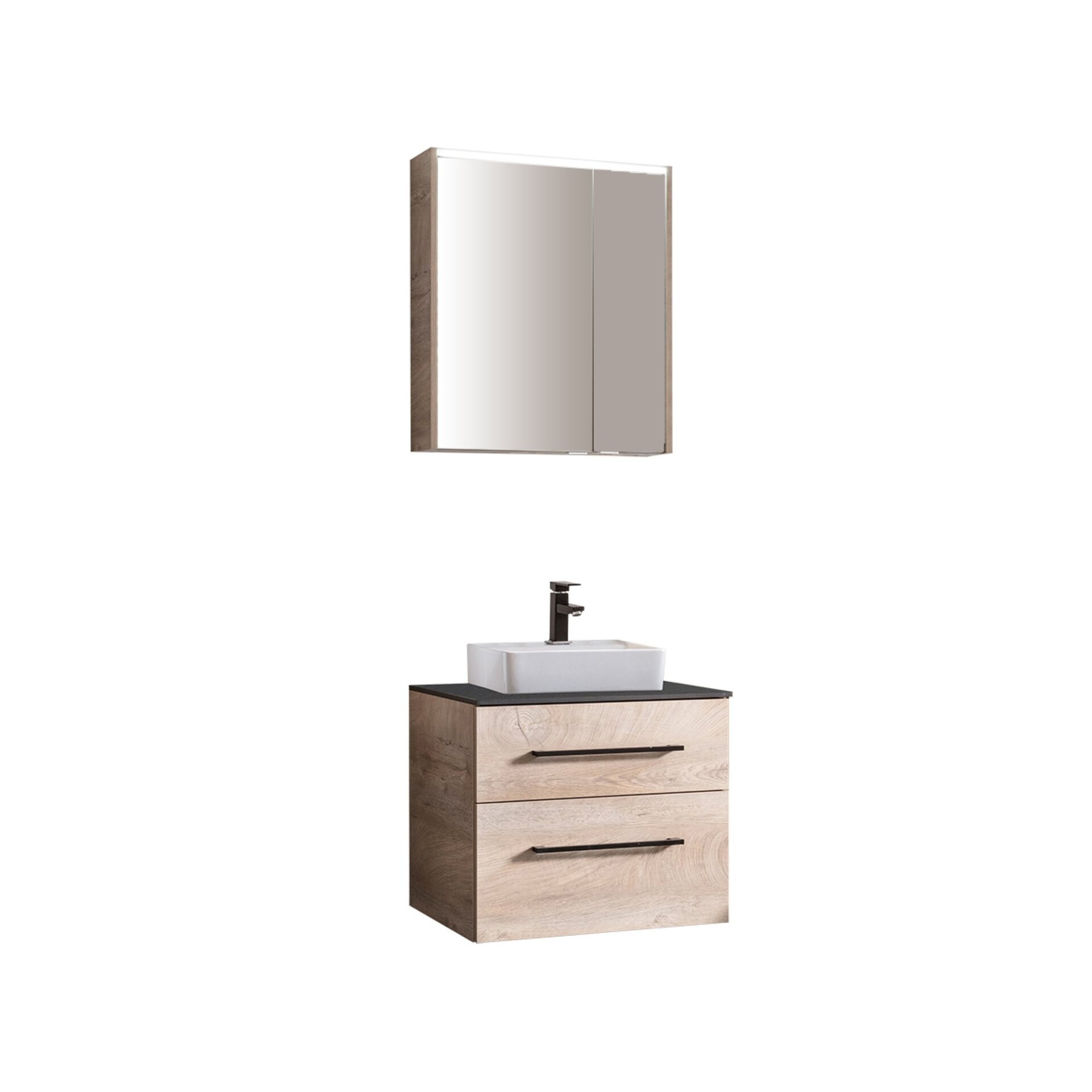 Die vier Komponenten des Sets sind sorgfältig aufeinander abgestimmt und bieten neben ansprechender Optik auch hohen Stauraum. Die Möbel sind hochwertig verarbeitet und zeichnen sich durch robuste Materialien sowie eine pflegeleichte Oberfläche aus. Die Kombination aus hellbraunen Fronten und der weißen Keramik schafft eine harmonische Verbindung von Natürlichkeit und Eleganz.
