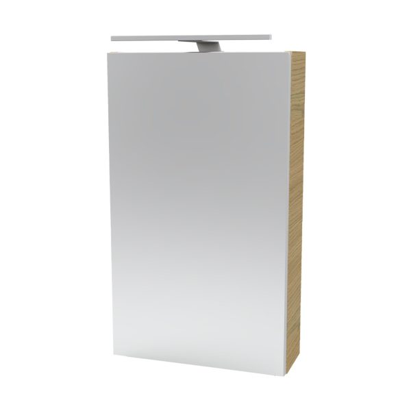 Der Spiegelschrank verfügt über eine links angeschlagene Tür, welche eine platzsparende Öffnung ermöglicht. Hinter der Tür bietet er ausreichend Stauraum für Hygiene- und Pflegeartikel. Die helle Holzoptik in Braun sorgt für eine warme Atmosphäre und harmoniert mit verschiedenen Badstilen – von klassisch bis modern.