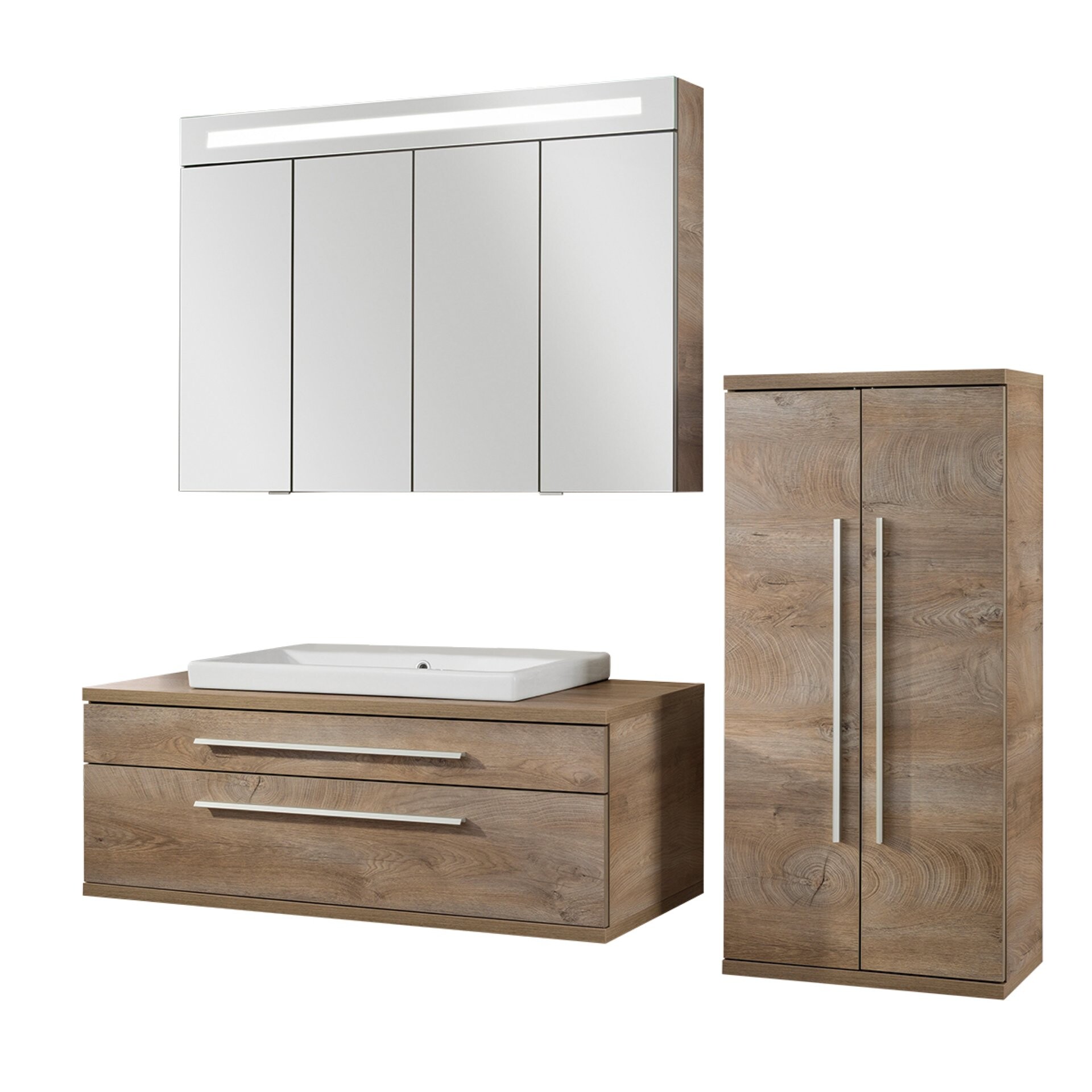 Fackelmann STANFORD Badmöbel Set 4-teilig, 110 cm breit, Braun, Keramik+Spiegelschrank+Midischrank