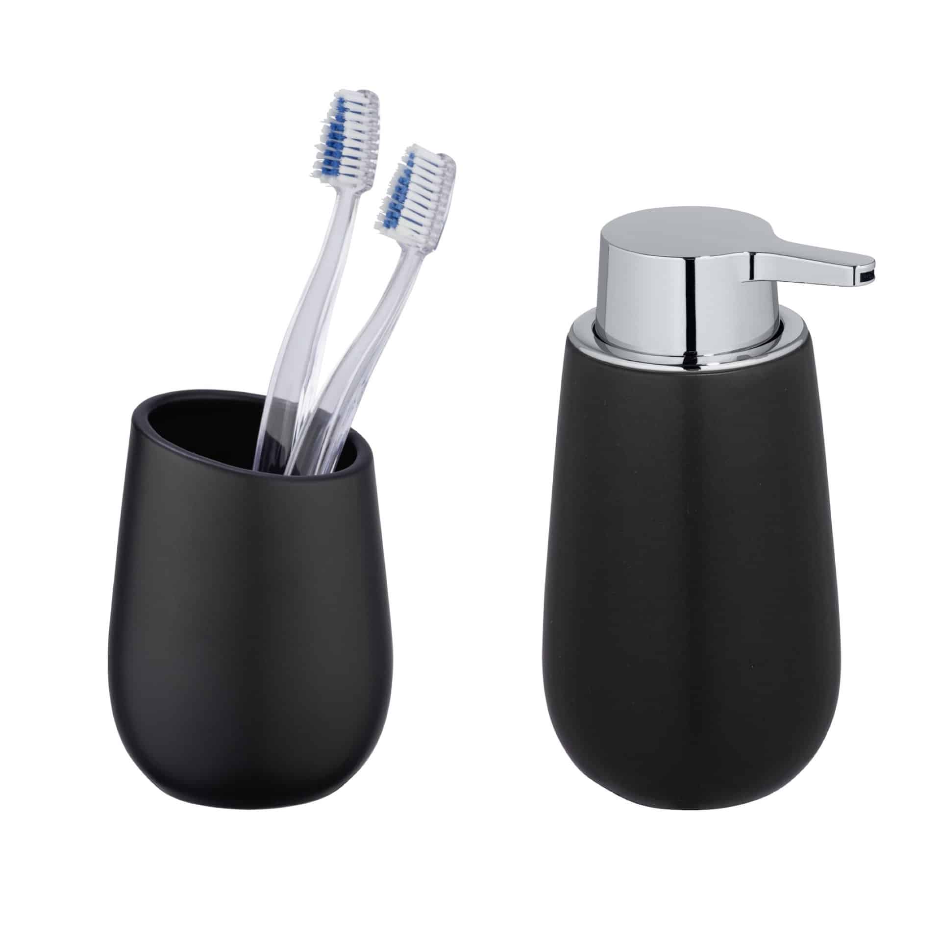WENKO BADI Accessoire Set, Schwarz – Zahnputzbecher & Seifenspender aus Keramik