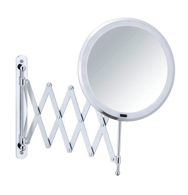 Der Spiegel ist aus robustem, chromfarbenem Metall gefertigt und verfügt über eine flexible Auszieh- und Schwenkfunktion, die eine individuelle Anpassung des Blickwinkels ermöglicht. Die LED-Beleuchtung sorgt für eine gleichmäßige und augenschonende Ausleuchtung, die sich ideal für Detailarbeiten im Gesicht eignet. Der Spiegel ist an der Wand befestigt und nimmt dadurch wenig Platz ein, was besonders in kleinen Badezimmern von Vorteil ist.